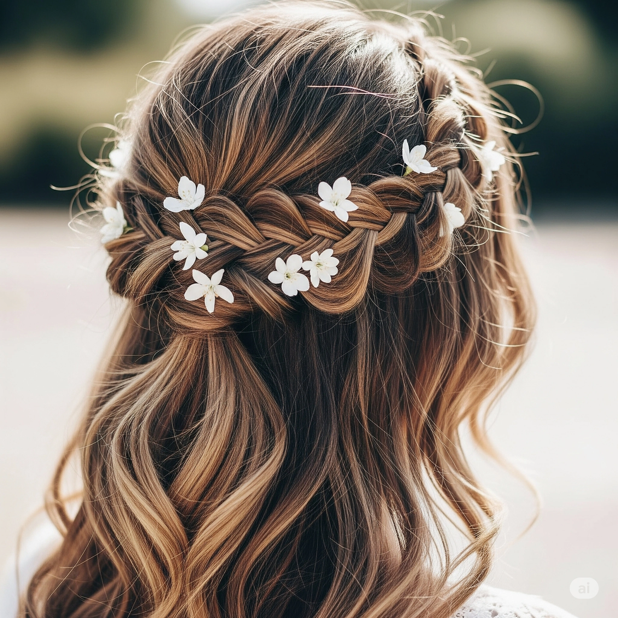 The hairstyle consists of gentle, loose waves that flow down the back, creating a romantic and ethereal appearance. A half-up braided crown adorns the top of the head, intertwined with small white flowers. This combination of elements results in a graceful and charming look perfect for special events.