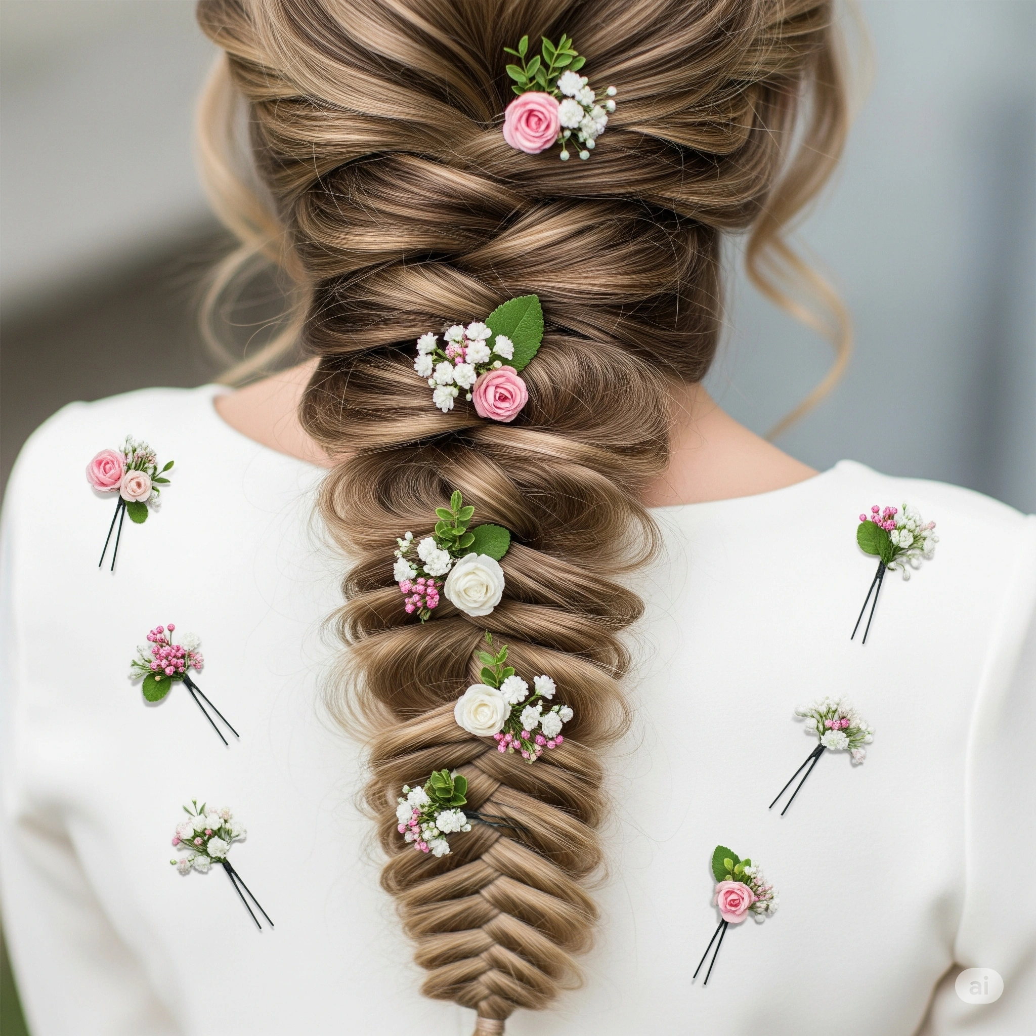 The hairstyle features a detailed fishtail braid embellished with small floral pins. This look combines traditional braiding techniques with modern flair. The style is well-suited for special events and pairs nicely with festive, elaborate outfits, enhancing the overall appearance with a touch of sparkle and charm.