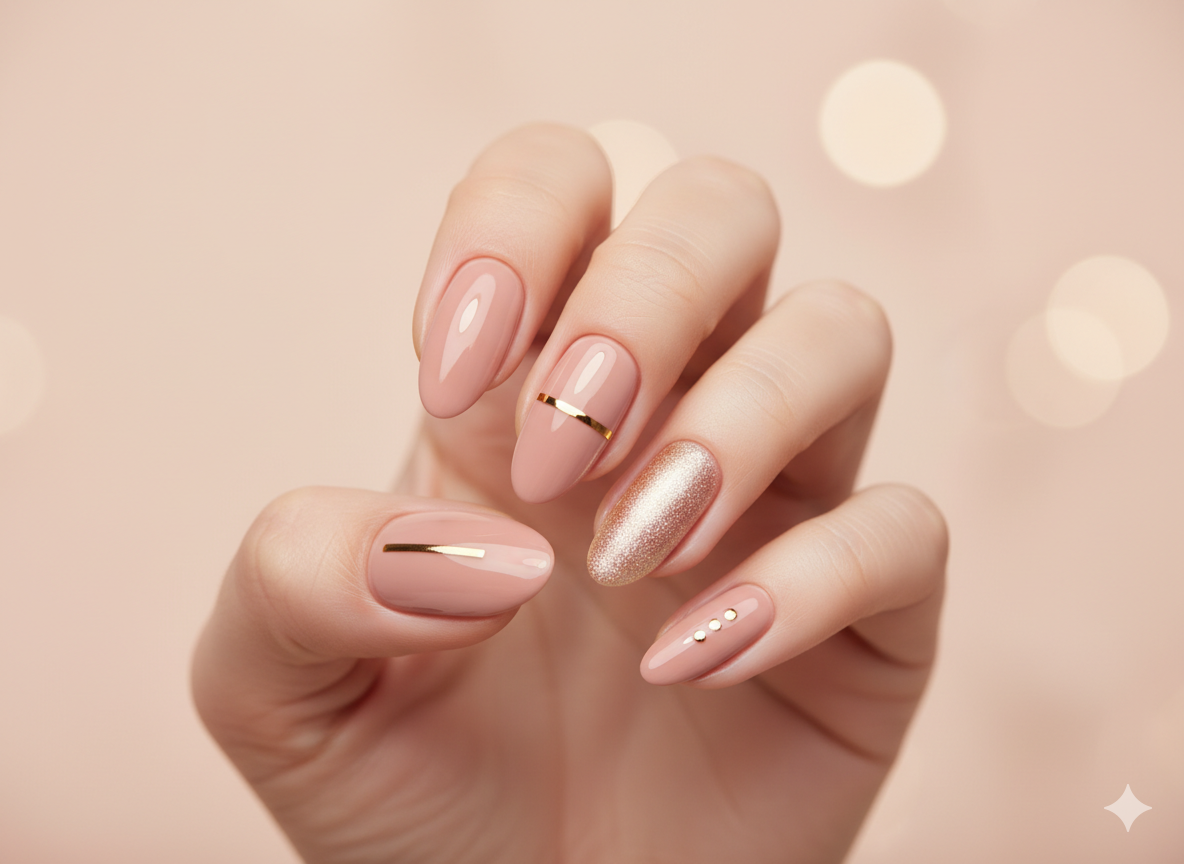Almond-shaped nails enhance the elegance of blush pink designs. The tapered, soft silhouette naturally looks feminine and graceful. Floral patterns flow beautifully across the curved surface, while gold accents appear refined rather than harsh.