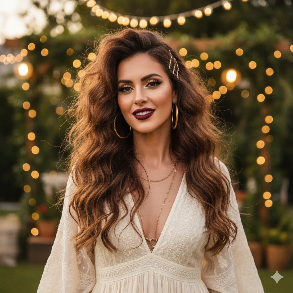 Sometimes, the best party look is carefree. The messy hairstyle embraces texture and volume, perfect for casual or bohemian-themed events. Long hair is tousled into effortless waves or curls, secured loosely with pins. As one of the easiest DIY party hairstyles for long hair, it highlights natural beauty while creating a relaxed yet stylish vibe. This look pairs wonderfully with bold makeup or statement accessories, making it a go-to for those who want a chic but not overly polished hairstyle.
