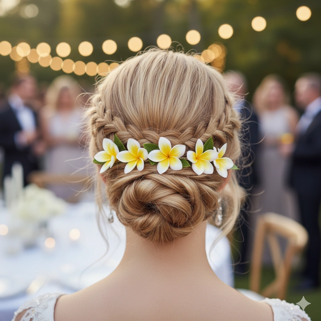 Hair updos with plumeria flowers epitomize tropical beauty, bringing elegance, fragrance, and exotic charm to your style. Whether for weddings, beach parties, or casual summer looks, hair updos with plumeria highlight femininity while adding a natural, floral accent. Perfect for medium to long hair, these updos offer versatility, from sleek buns to soft braids.
