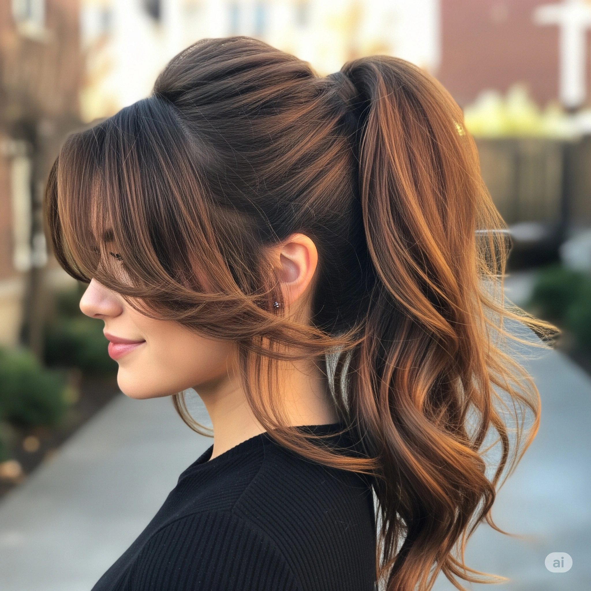 A high ponytail with curtain bangs is trendy, chic, and universally flattering. The height of the ponytail creates a lifting effect, while curtain bangs frame the face softly. This hairstyle balances playful charm with elegance, making it suitable for everyday wear and evening outings. Among ponytails with bangs, this variation is one of the most popular due to its effortless beauty and versatile appeal. Expect compliments wherever you wear it.