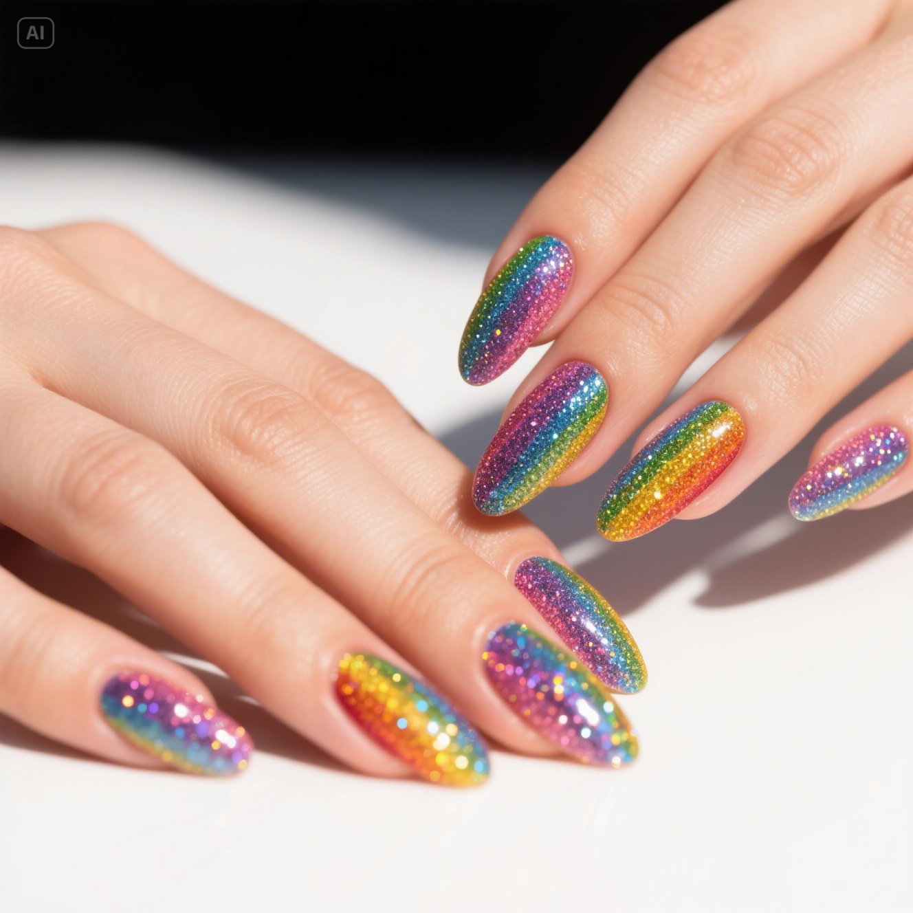 On long stiletto nails, rainbow glitter tips look fierce and fashion-forward. The elongated shape shows off the color shifts beautifully.