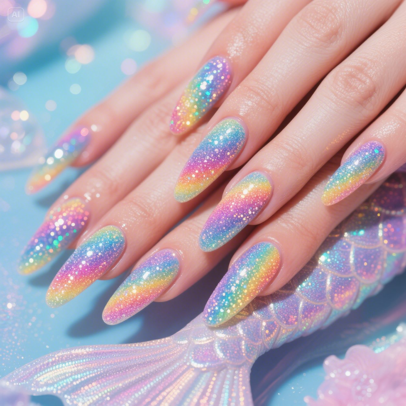 Blend pastel blues, greens, purples, and pinks with iridescent glitter for a magical, ocean-inspired rainbow look. Perfect for beach vacations.