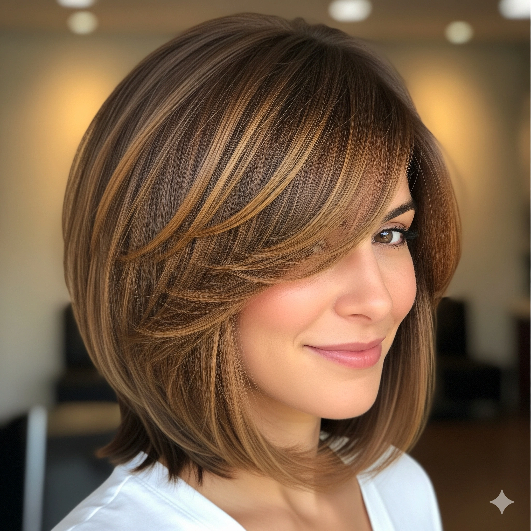 Adding layers to a bob cut instantly enhances its texture, and when paired with side-swept bangs hairstyles, the result is chic and dynamic. The layers add dimension and volume, while the side-swept bangs soften the overall look. This combination is easy to style and maintain, making it an excellent everyday haircut. Side-swept bangs hairstyles elevate the classic bob, offering a youthful and polished vibe that flatters women of all ages and face shapes.