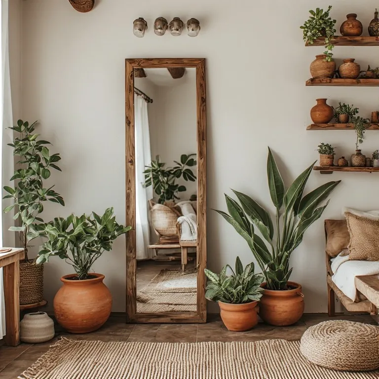 A wooden frame mirror paired with clay planters creates a warm countryside feel.