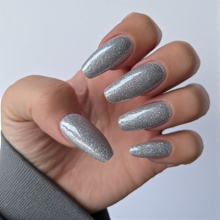 Silver glitter nails are perfect for celebrations. They shine beautifully and look amazing in photos.