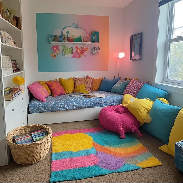 A reading corner encourages quiet time. Add a small rug, cushions, and a basket of books. It doesn’t need much space or money. This cozy spot helps kids relax and enjoy reading.