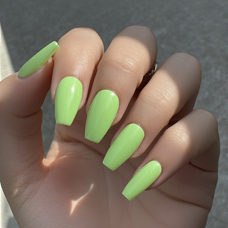 Start by shaping your nails into a coffin shape. Apply a base coat, then your chosen color. Finish with a glossy top coat for that shiny look.