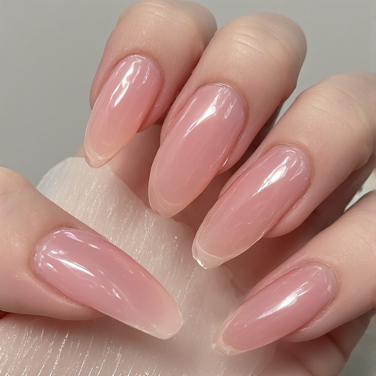 Sheer pink nails look natural and shiny. They are perfect for a clean and soft appearance.