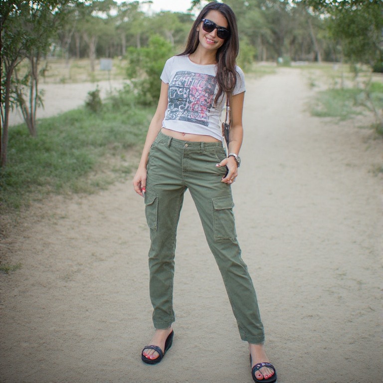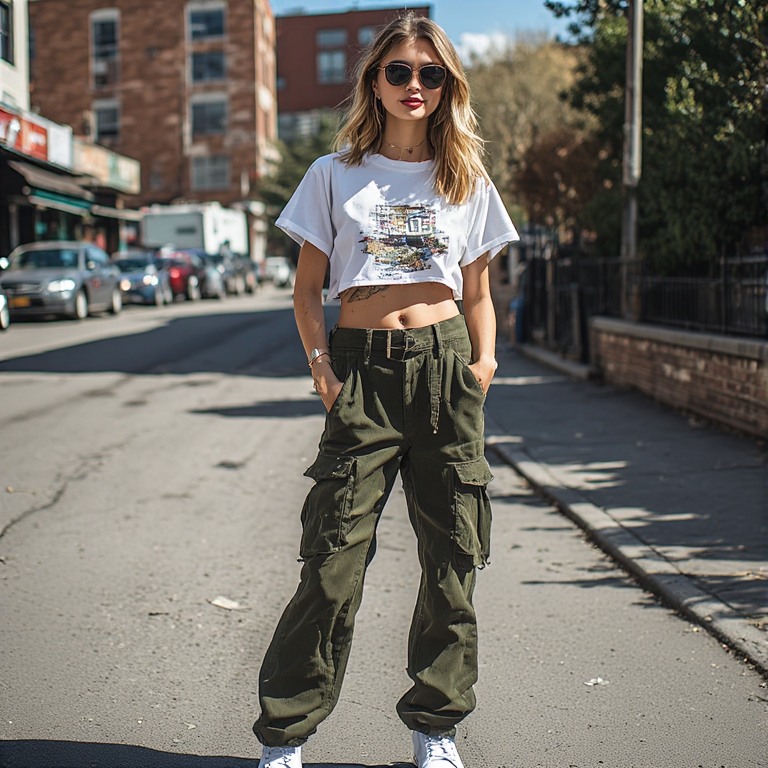 This one is trendy and stylish. Cropped tees with high-waisted cargo pants create a balanced and modern outfit.