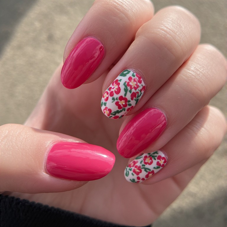 Floral designs add a soft and cute touch to bold hot pink nails.