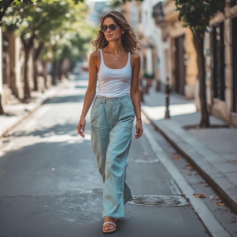 This outfit is stylish and breathable. Tank tops keep your upper body cool, while wide-leg pants allow air to move freely.
