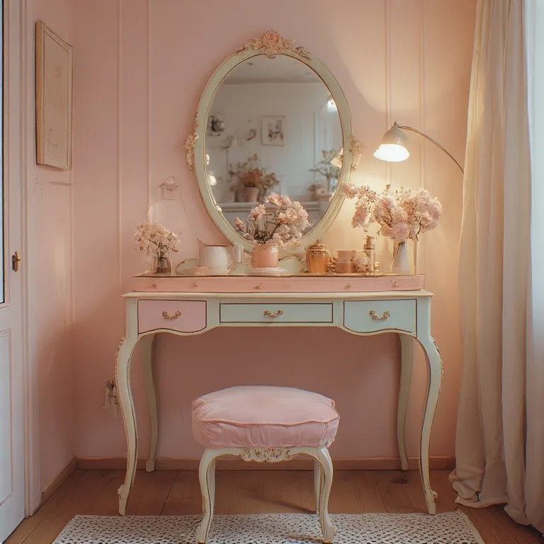 Think pastel shades, curved legs, and oval mirrors. It feels romantic and cozy.