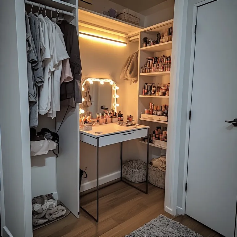 Install a slim desk inside the closet. Add a mirror and small light. It becomes your private beauty area.