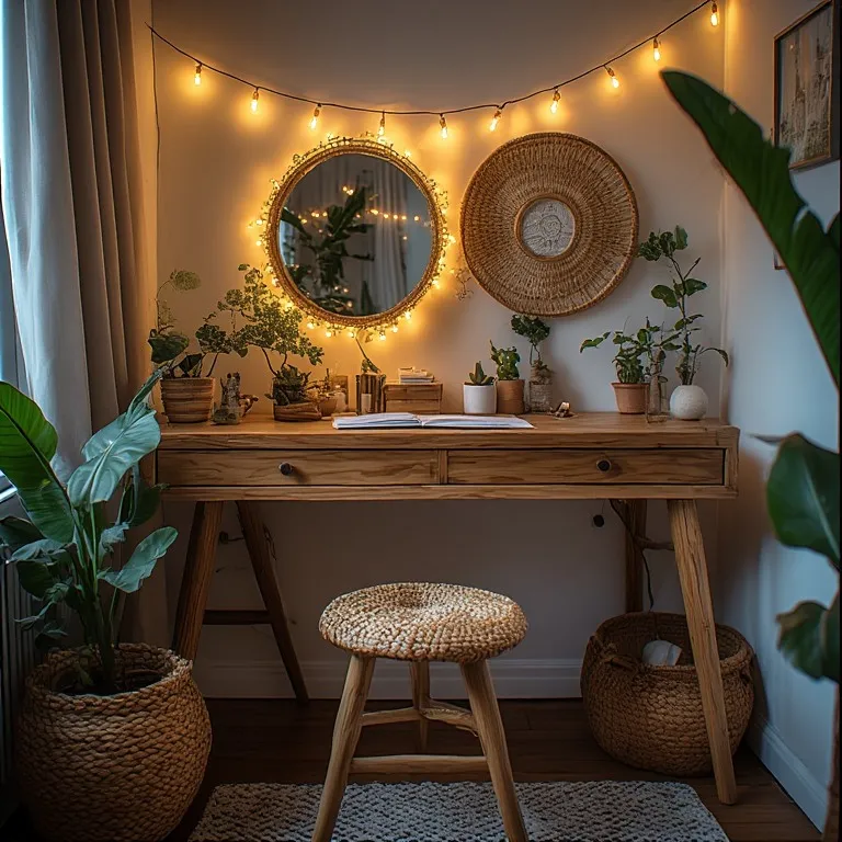 Use a wooden desk, woven stool, and rattan mirror. Add soft textures. It feels warm and welcoming.