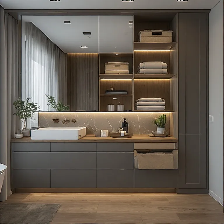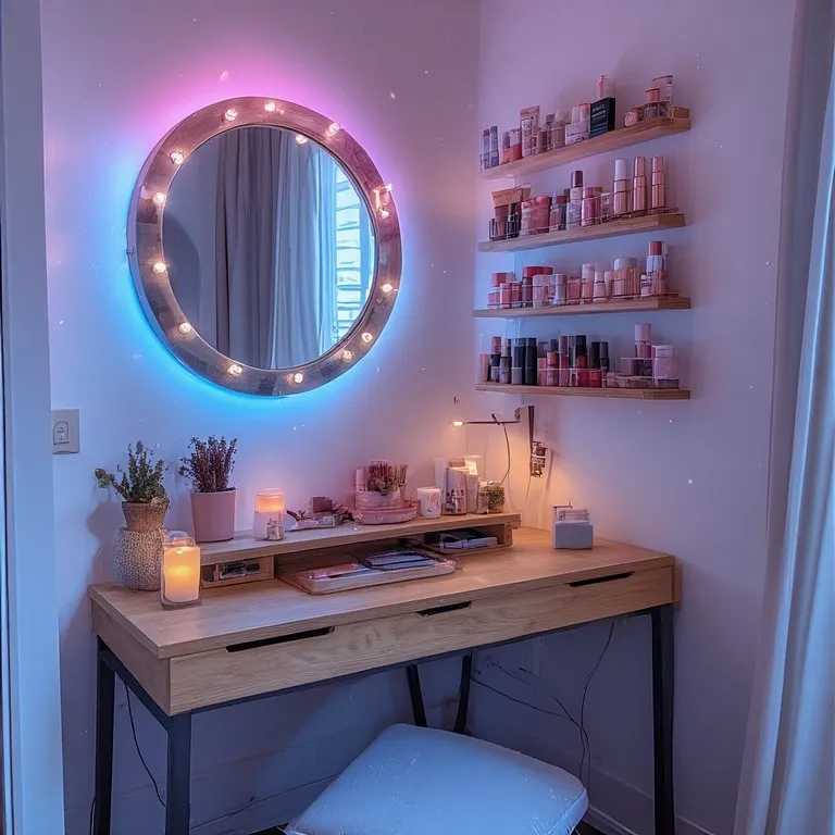 Add wall shelves above the vanity. Use small organizers for makeup brushes and lipsticks. Vertical storage is your best friend in small apartments.
