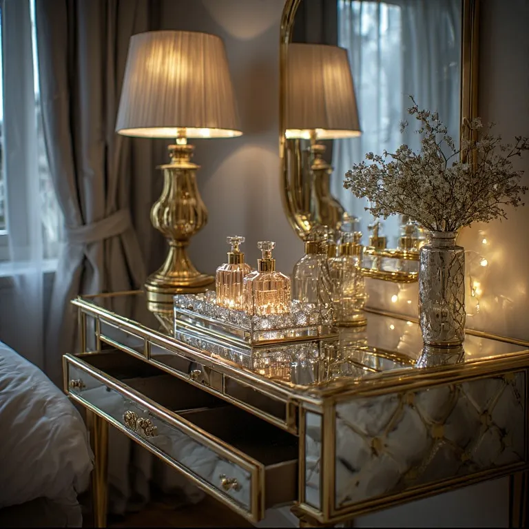 Keep the top clean. Add a crystal perfume tray or a small vase with flowers. Less clutter means more luxury. Think simple but shiny.