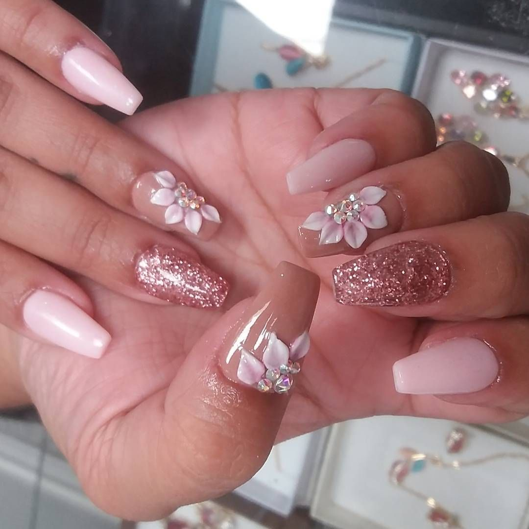 Take your manicure to the next level with 3D flowers, rhinestones, or pearls. Each nail can have a different textured floral accent, making the set stand out.