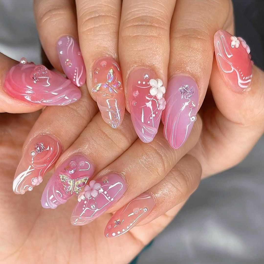 Combine ombre gradients (like pink fading to white, or blue fading to lilac) with floral art. Each nail can showcase a different flower on top of the gradient base.