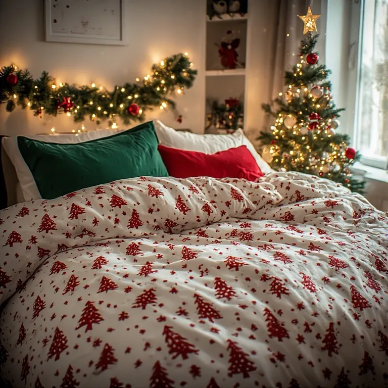 Bedding with small red trees on a white background looks festive but not too heavy. It feels joyful without being too much.