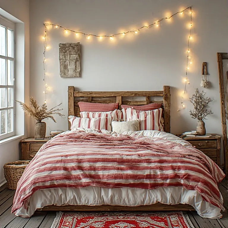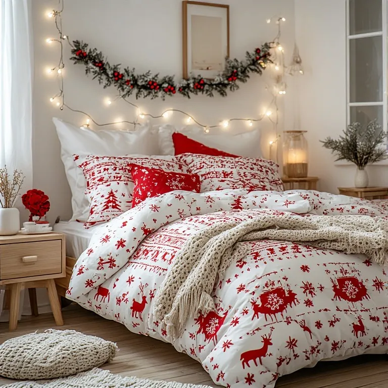 Want to make it even cozier? Add soft fairy lights around your headboard. The warm glow against the red bedding creates a dreamy holiday atmosphere.