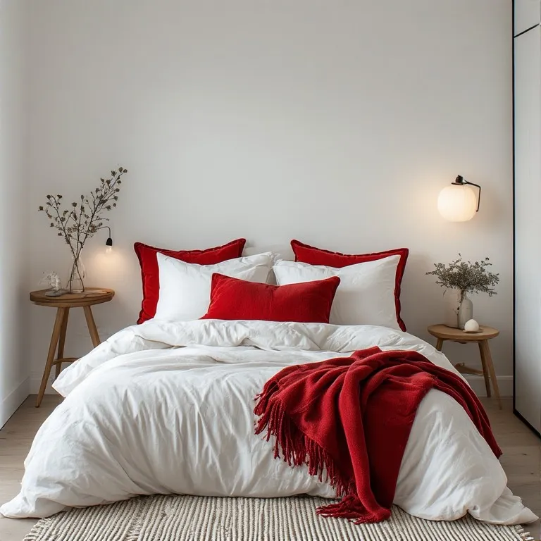 Start with a plain white comforter or duvet. White makes your room feel fresh and open. Then add red accent pillows or a red throw blanket at the end of the bed. That’s it. Simple, right? But it looks beautiful.