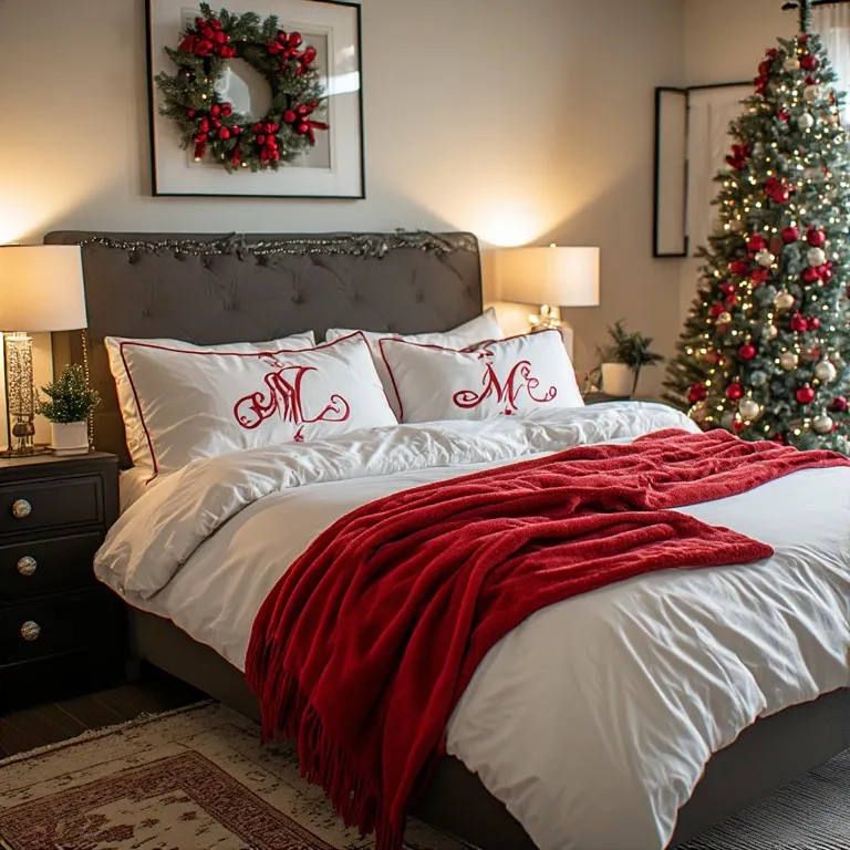 Start with a deep red comforter or duvet. Then add white pillowcases or a white bed skirt. If you want to go further, add Santa-themed throw pillows or a fluffy white blanket at the end of the bed. The white details break up the red and make it pop.