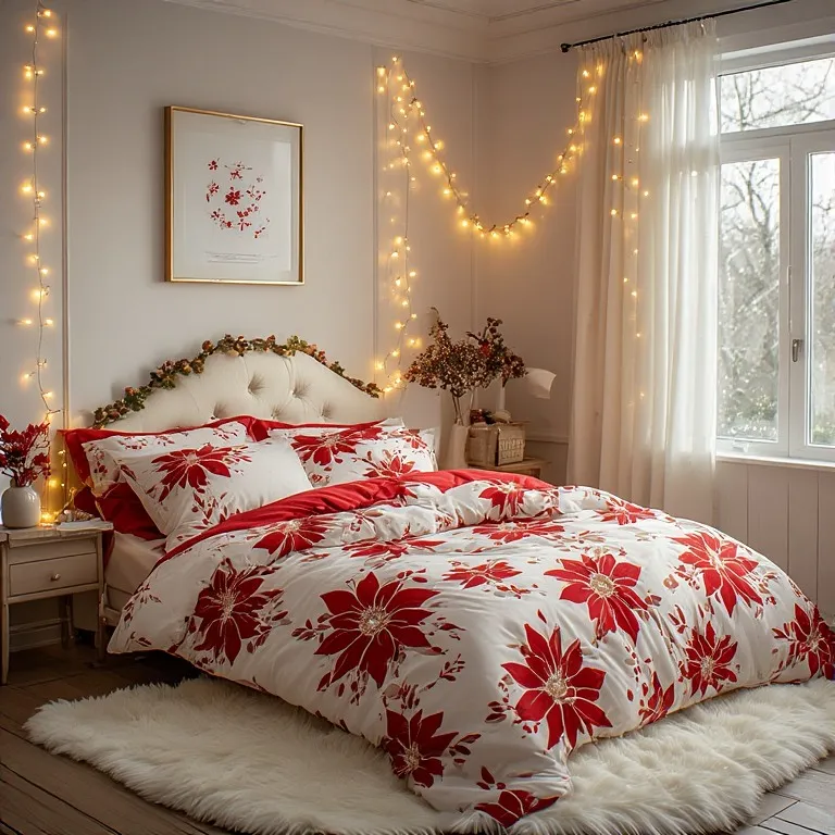 Flowers are not just for spring. Winter has its own special flower — poinsettia. Red and white floral bedding adds a soft and romantic touch to your Christmas bedroom.