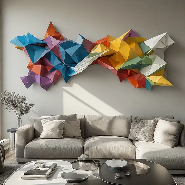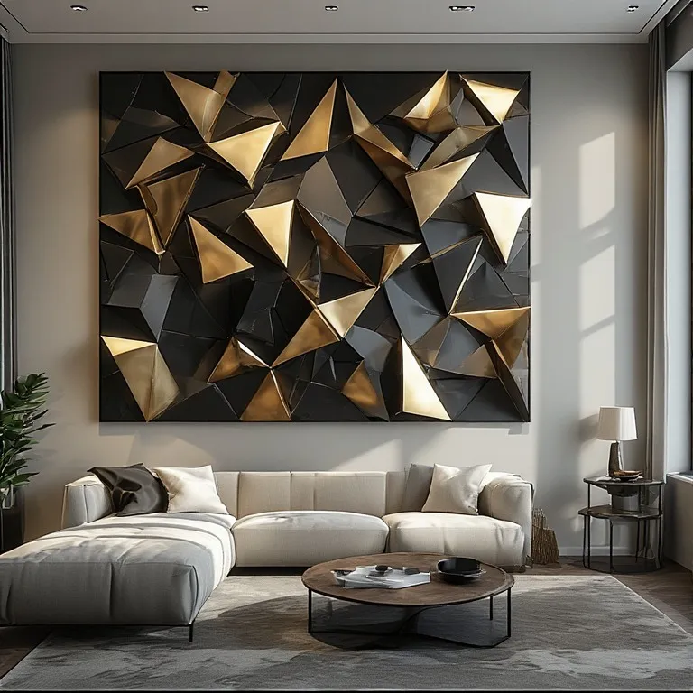 Lighting plays a key role here. Directional lighting emphasizes angles and shadows, enhancing the three-dimensional effect. Placement matters too — over a sofa, console, or bed works perfectly. Geometric sculptures balance modern furniture and clean lines, making the room feel both sophisticated and artistic.