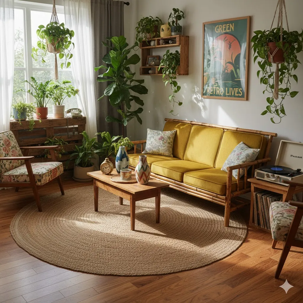 Your living room should feel like a warm hug from the past. Start with a retro sofa in mustard or teal, add a patterned rug, and throw in some wooden furniture. Use metallic lamps or framed art to complete the look. The goal is to make your living room cozy, welcoming, and full of character — a perfect blend of old and new.