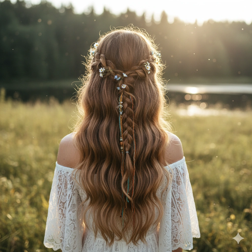 The bohemian waterfall braid is relaxed and carefree, perfect for outdoor weddings, festivals, or beach days. This waterfall braid for long hair incorporates small flowers, beads, or threads into the braid, giving it a rustic and artistic touch. The loose and natural flow of hair complements boho outfits beautifully. It’s ideal for women who want to embrace individuality and creativity in their hairstyle. This version of the waterfall braid for long hair symbolizes freedom and effortless beauty.